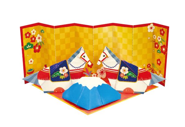 2枚のウマと富士山が入っている豪華なセット内容です。富士山は折る向きを変えることで赤富士と青富士の2パターン作ることができます。