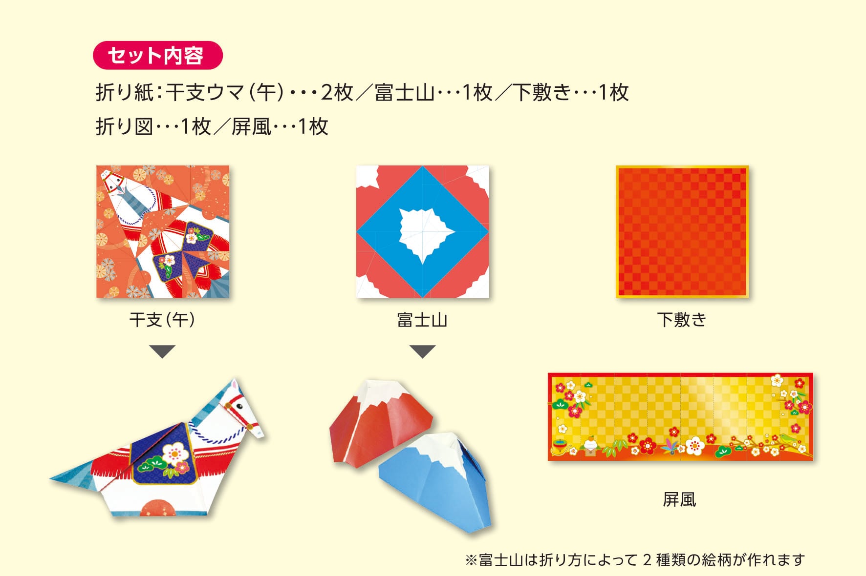 1個当たりのセット内容:5枚入り(干支(午)2枚、富士山1枚、敷紙1枚、折り方説明書1枚)